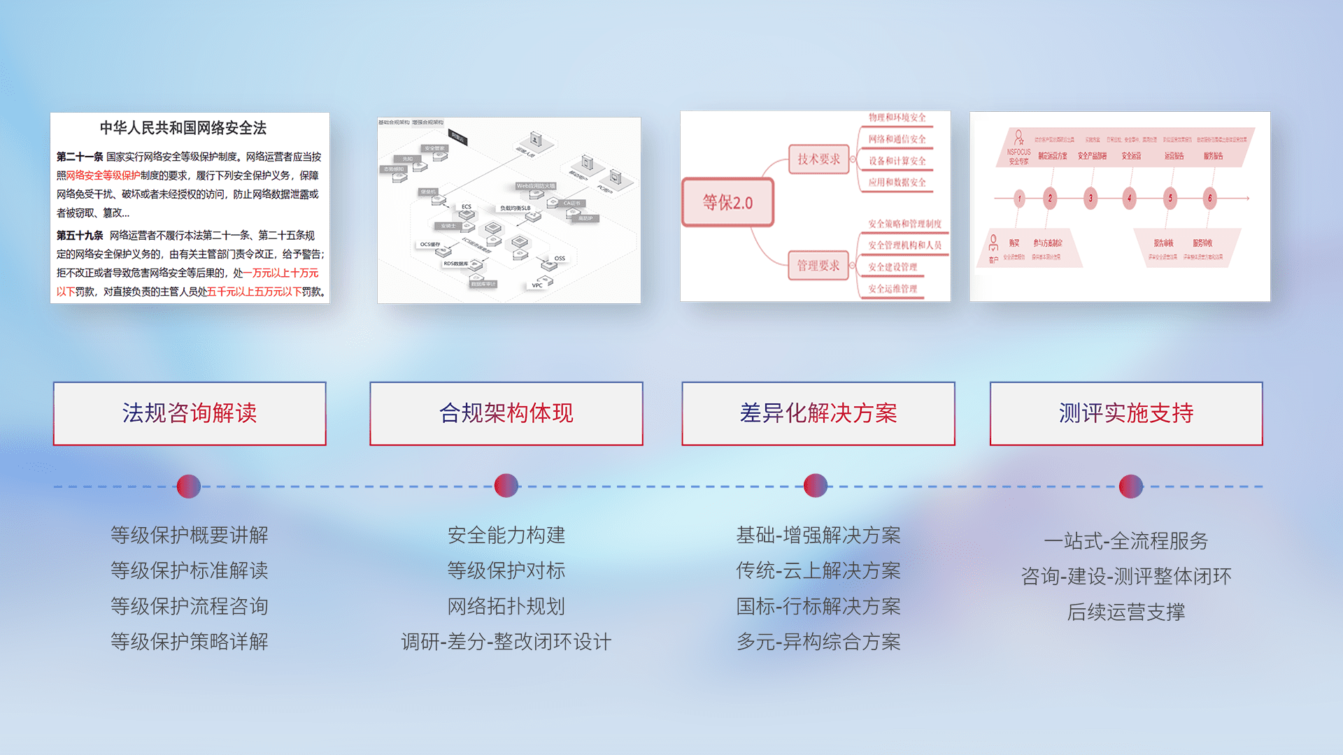 通过专业的法律咨询解读、、合规架构体现、、、、差异化解决方案、、、测试实施支持等服务,,,为客户量身打造等保合规体系。。